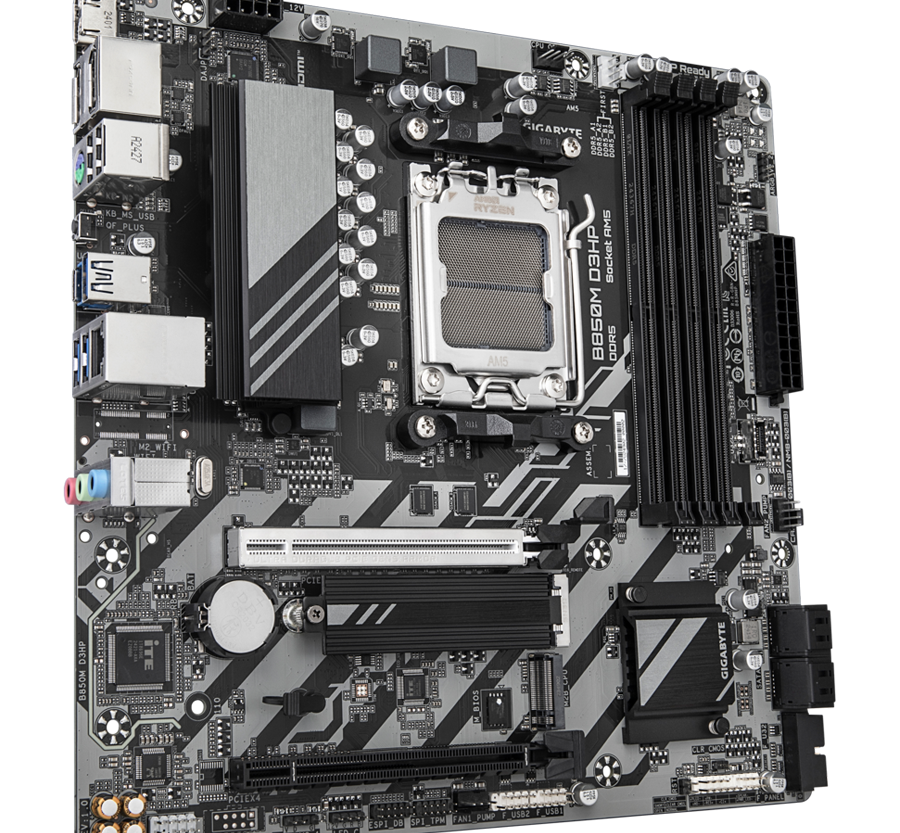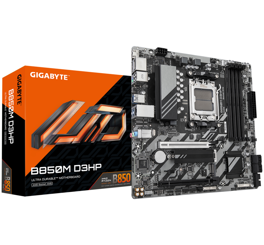 GIGABYTE Mainboard Desktop B850M D3HP (AM5, 4xDDR5, 2xDP, 1xHDMI, GLAN, 1x PCIe x16 5.0, 1xPCIe x16 supporting PCIe 3.0 x4, 2xM.2, 4xSATA3) mATX