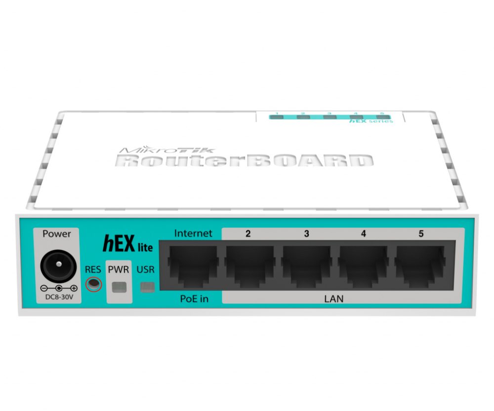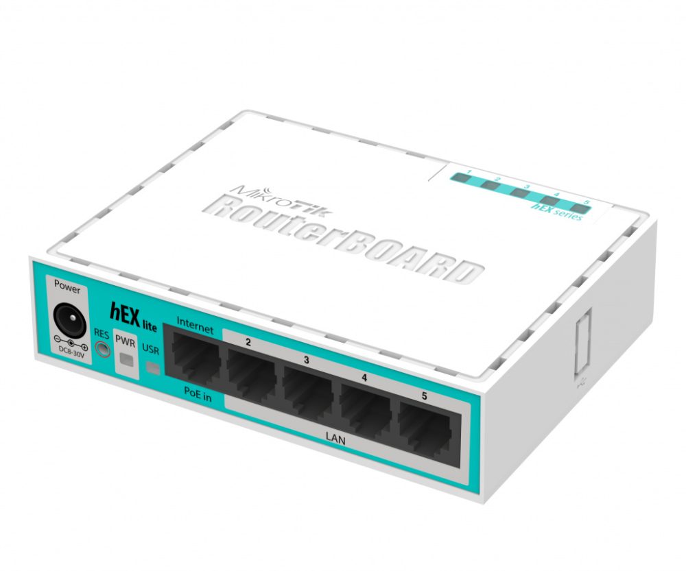 Mikrotik RB750r2 hEX lite, 850MHz CPU, 64MB RAM, 5×LAN, RouterOS L4, plastično kućište, PSU