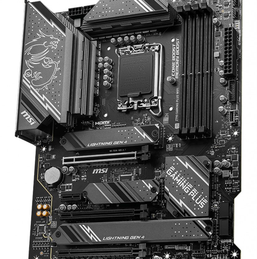 MSI Z790 GAMING PLUS WIFI , LGA 1700, 4xDDR5, Dual Channel DDR5 up to 7200+(OC)MHz, 3x PCIe x16 slot, 4x M.2 slots, 1x USB 3.2 Gen 2×2 (Type-C), 3x USB 3.2, 4x USB 2.0, 1x HDMI, 1x DP, 4x EZ Debug LED, 2.5G LAN, 7.1 Audio, ATX, 3Y
