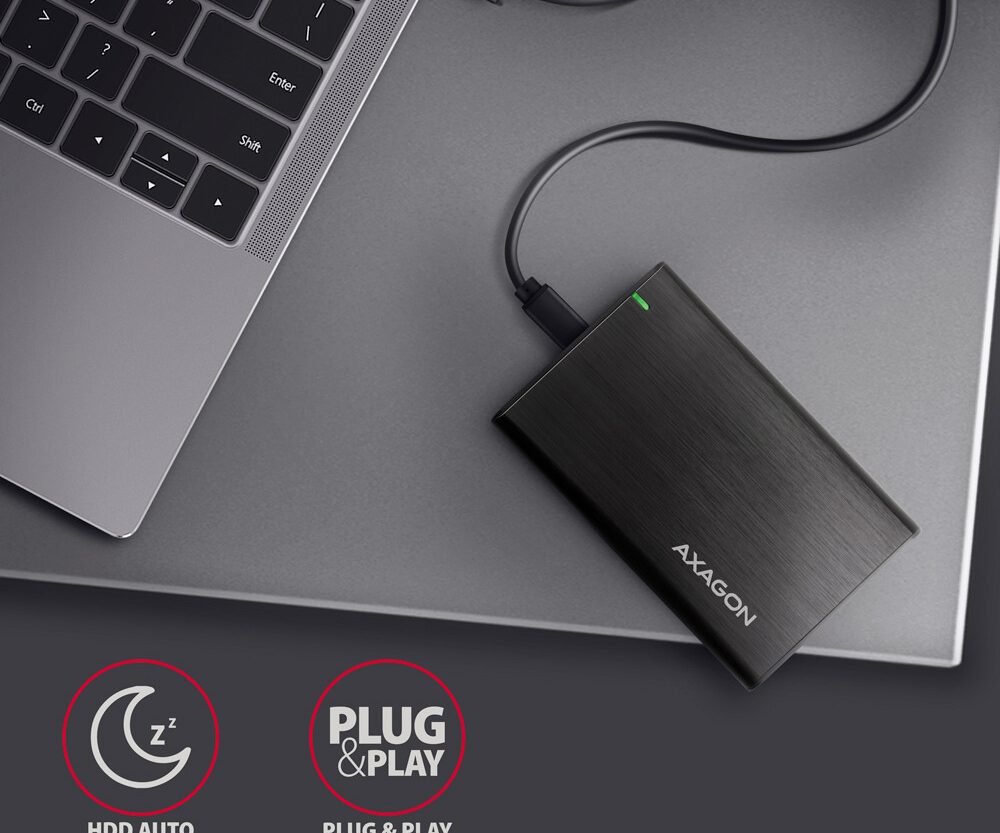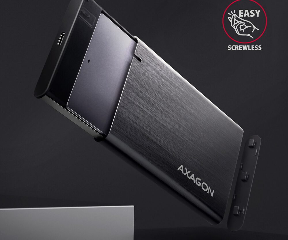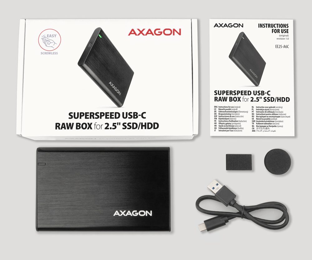 Aluminijska vanjska ladica bez šarafa AXAGON EE25-A6C RAW box s USB 3.2 Gen 1 (USB 3.0) sučeljem dizajnirano je za 2.5″ SATA hard diskove ili SSD-ove. Dvostruka USB-C veza na ladici isporučena zajedno s USB-C -> USB-A kabelom omogućava pouzdanu vezu s računalom. SATA 6G sučelje s UASP podrškom omogućava vam užitak brzine modernih SSD-ova.