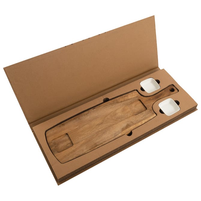 set daske za posluživanje i rezanje od bagremovog drva i dvije keramičke zdjelice za umake; daska 50×1,7×14.4 cm; posuda 6,2×2,4×6,2 cm
