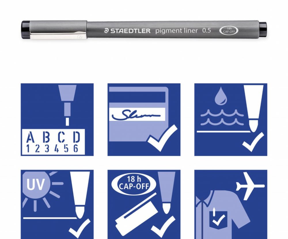 okrugli vrh sa metalnim ojačanjem; spremnik PP; permanentni (sukladno ISO 14145-2), pigmentni; vodootporan; može se brisati u slučaju upotrebe na papiru za precrtavanje; otporan na UV svjetlost; može biti nezatvoren 12 sati bez isušivanja (CAP OFF); idealan za crtanje, skiciranje i pisanje; siguran rad u zrakoplovu zahvaljujući sustavu za izjednačavanje tlakova koji sprječava istjecanje tinte (airplane safe)